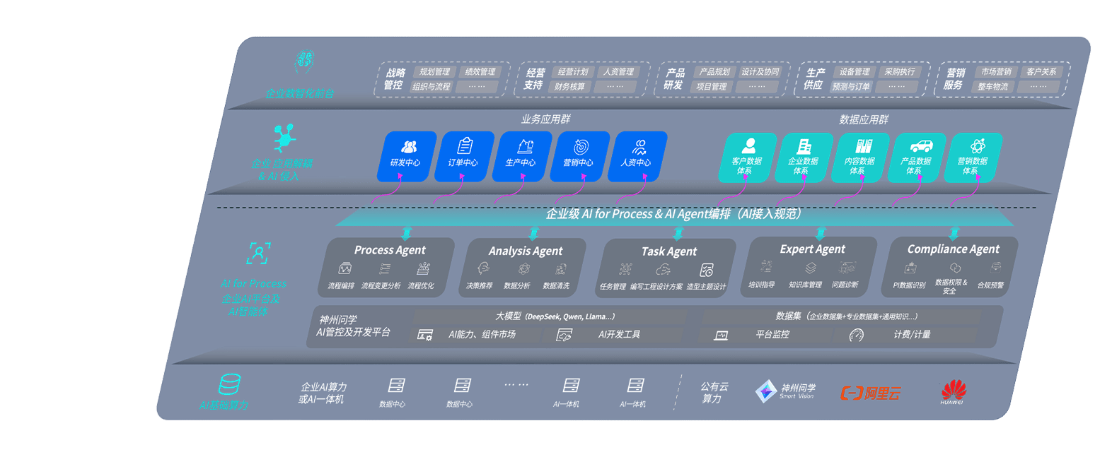端到端的一站式AI工作空间深度融合了从企业战略规划到日常经营的全流程业务板块,,,定向解决车企内部领域多、、、、部门多、、链条长、、、场景碎片化等难题,,,支持车企快速构建以AI为核心的生产力写作体系,,,实现任务执行与AI能力的无缝集成与交互